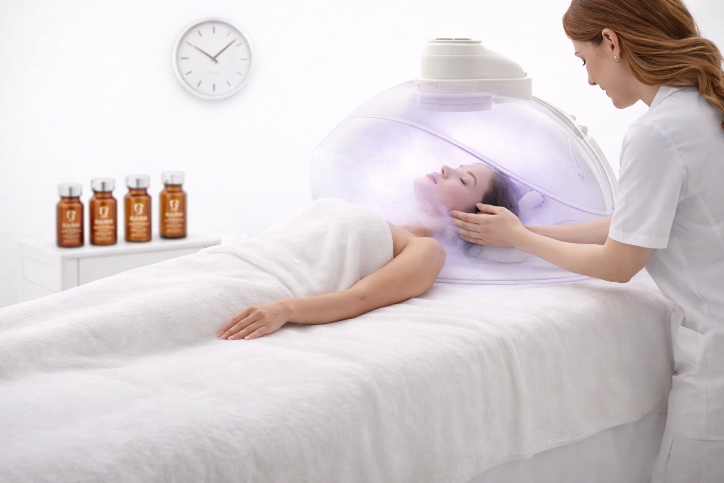 Advanced oxygen dome therapy combining targeted LED, cryogenic activation, and nutrient infusion to deeply hydrate, calm inflammation, and restore glass-like luminosity — with zero downtime.